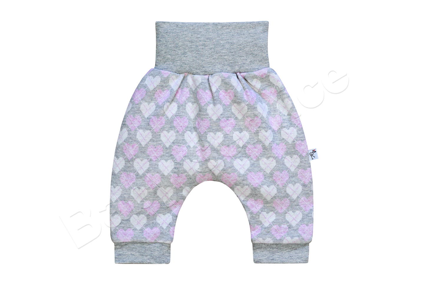 Pohodlné kalhoty ve stylu buggy se vzorem srdíček mají v pase široký úplet pro pohodlí miminka