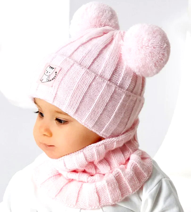 - Čepice dívčí 2 bambule třpytivá + nákrčník sv.růžová