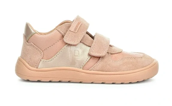 Dívčí jarní barefoot boty jsou vyrobeny z kombinace přírodní a broušené kůže v broskvové barvě, doplněné perleťovými detaily. Boty jsou celokožené, nižšího střihu. Dva suché zipy pevně fixují botu na noze. Uvnitř mají netvarovanou, vyjímatelnou koženou stélku. Kulatá podešev má jemný protiskluzový dezén, je odolná, ale velmi ohebná.