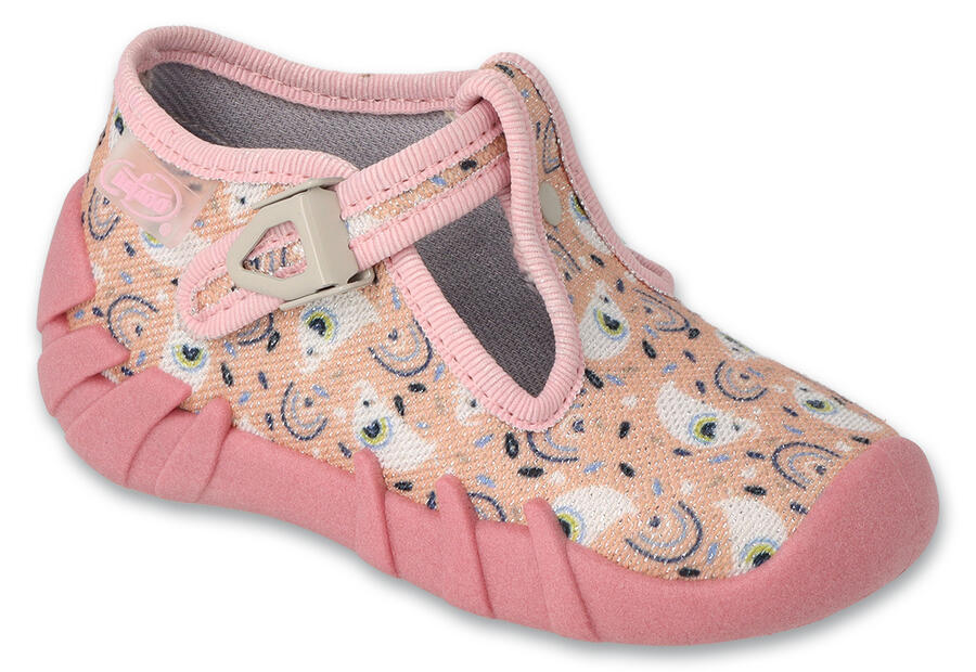 Lehká, pružná a protiskluzová podrážka - usnadňující chůzi a běh, která působí i proti únavě nožiček dětí. Odvětraná podrážka zajišťuje odvod nadměrné vlhkosti a prodyšnost boty a tím pohodlí pro celodenní nošení doma i ve školce. Zapínání na přezku - umožní praktické a pohodlné obouvání.