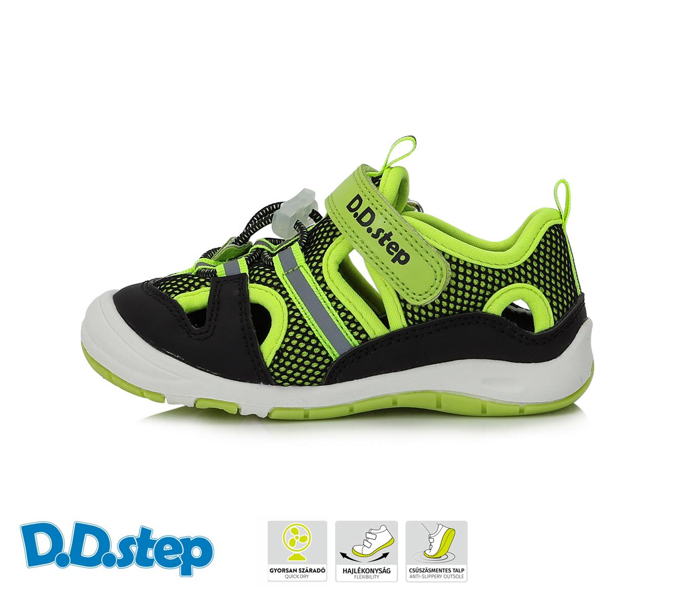Sportovní letní "větrací" obuv DDStep s krytou špičkou. Velmi ohebné a lehké. Z vnější strany převážně textilní, se syntetickými prvky na namáhaných místech, a reflexními prvky. Rychleschnoucí textilní podšívka a pěnová neklouzavá stélka tvoří ideální kombinaci na dětské aktivní léto. - Sednou na: n... celý popis