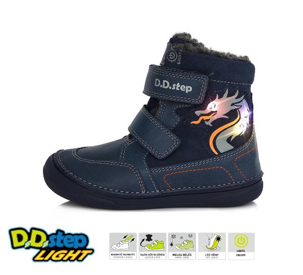 Dětské zimní izolované celokožené boty DDStep s ortopedickou odnímatelnou vložkou, jejíž horní část je vyrobena z vysoce kvalitní kůže, která zaručuje pružnost, prodyšnost a přizpůsobuje se tvaru dětské nohy. Blikající aplikace na straně nohy. Odnímatelné vložky mají speciální tvar pro maximální možnou stabilitu, ortopedická klenba podporuje zdravý vývoj nohy dítěte a speciální materiál tlumí nárazy při běhu. Podešev je protiskluzová z vysoce kvalitního přírodního kaučuku.