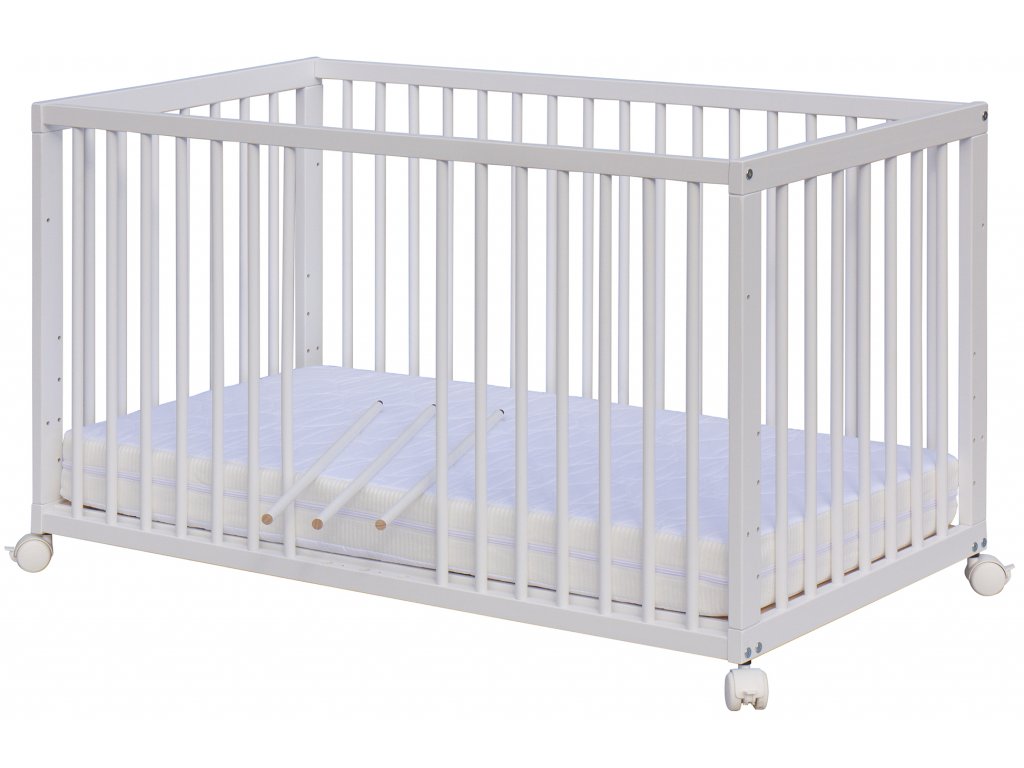 Kolečka, nízká válendová bočnice a ani matrace nejsou součástí postýlky, ale je možné si je objednat, dle vašich potřeb, z naší nabídky.