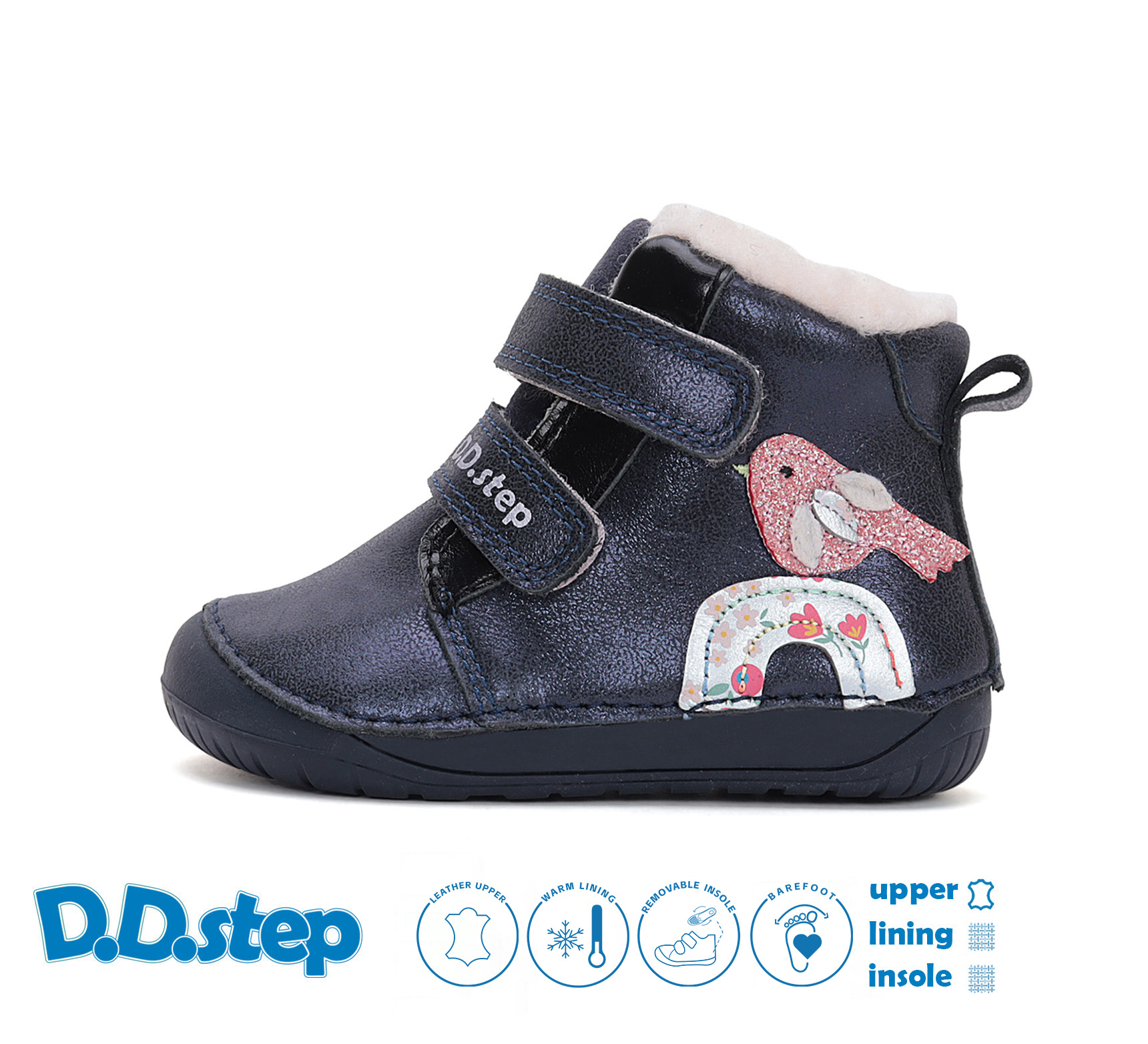 Zapínání na dva zipy, vnitřní podšívka i stélka zateplená kožíškem. Dokonalé barefoot botičky pro první krůčky.