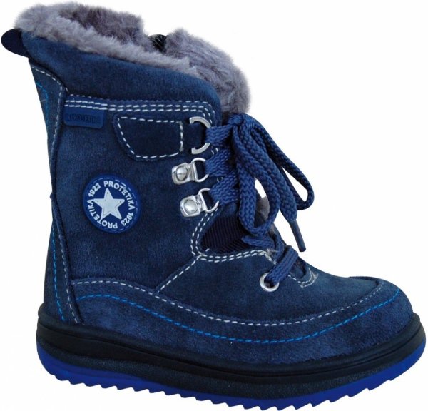 Dětská zimní vycházková obuv značky Protetika. Dětské boty jsou vyšší se zapínáním z boku na zip a z horní části šněrovací.