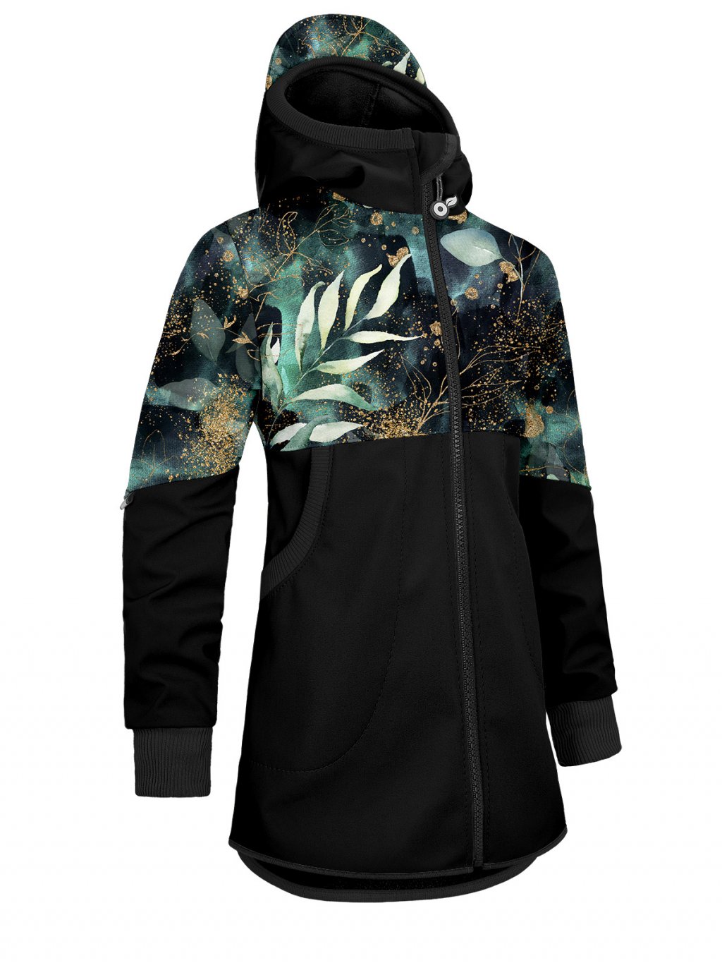- Dívčí softshellový kabát s fleecem černá/listy a větvičky
