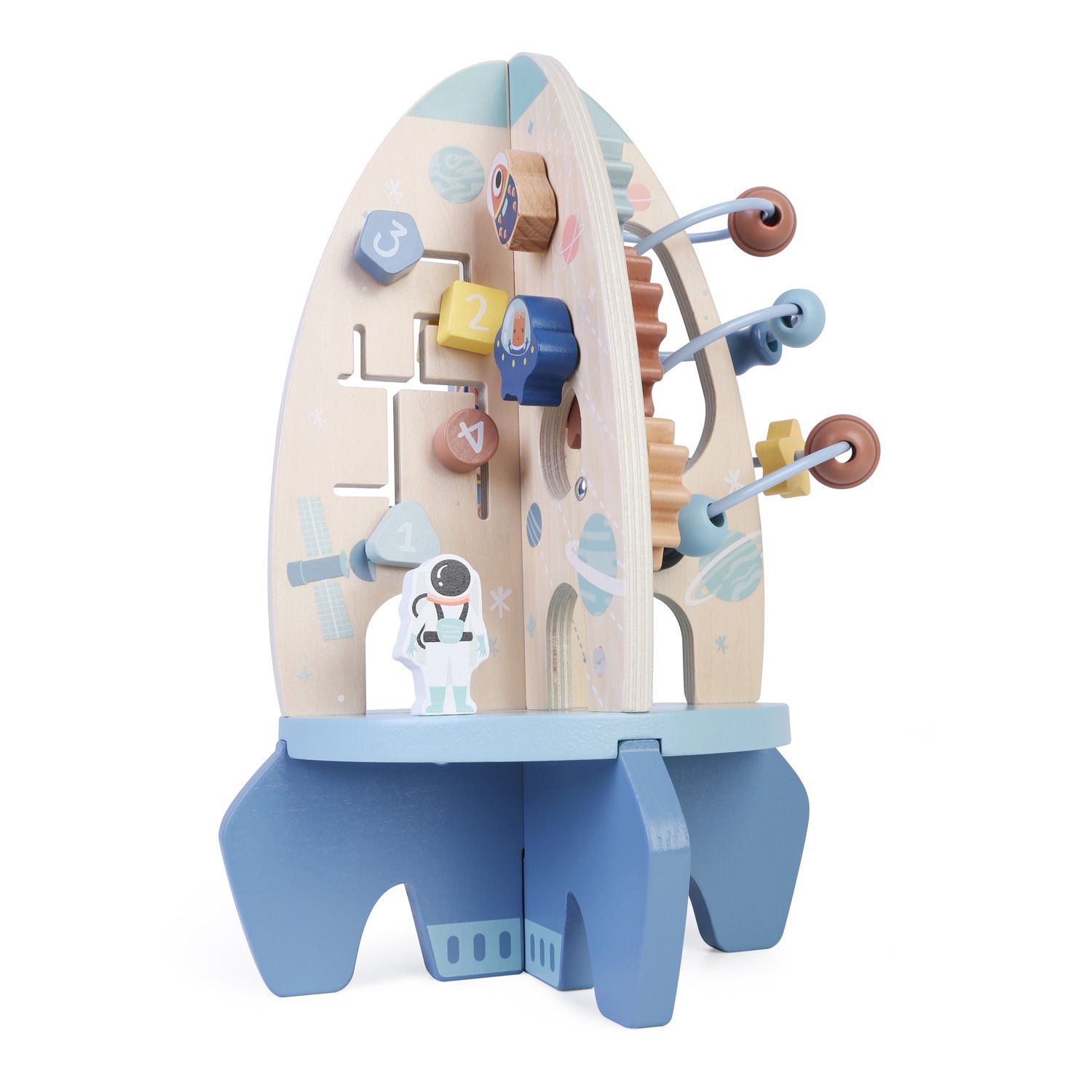 Raketa obsahuje různé hrací prvky, které budou bavit a učit vaše děti. Můžou posouvat barevné korálky po klikatém drátku v labyrintu, což rozvíjí jejich jemnou motoriku a koordinaci očí a rukou. Díky posuvným ozubeným kolečkům se děti seznámí s principem příčiny a následku. Na počitadle mohou posouvat kuličky a procvičovat si tak prostorovou orientaci a učit se počítat.