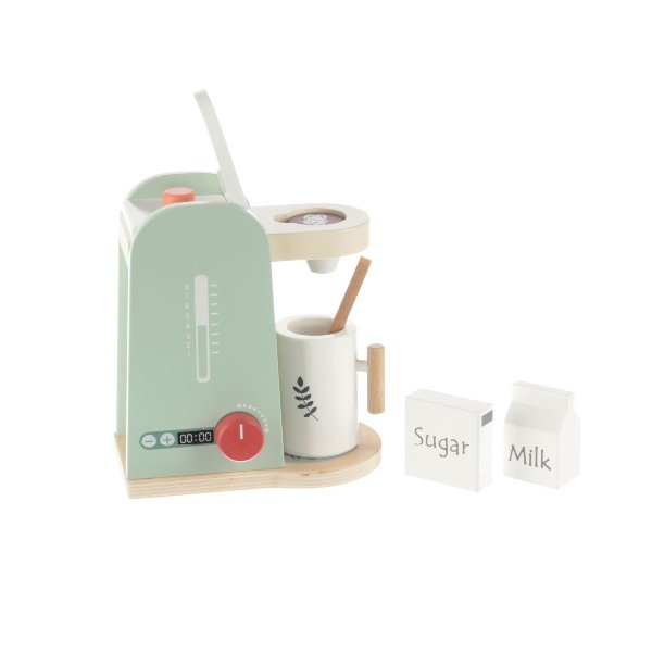 Propracovaný dřevěný kávovar přímo zve k přípravě dobré kávy. Kávovar má několik tlačítek, které lze otáčet nebo stlačit. Součástí je velký dřevěný šálek se lžičkou a suroviny na přípravu kávy. Hračka je vyrobená z kvalitního dřeva a barev na vodní bázi.