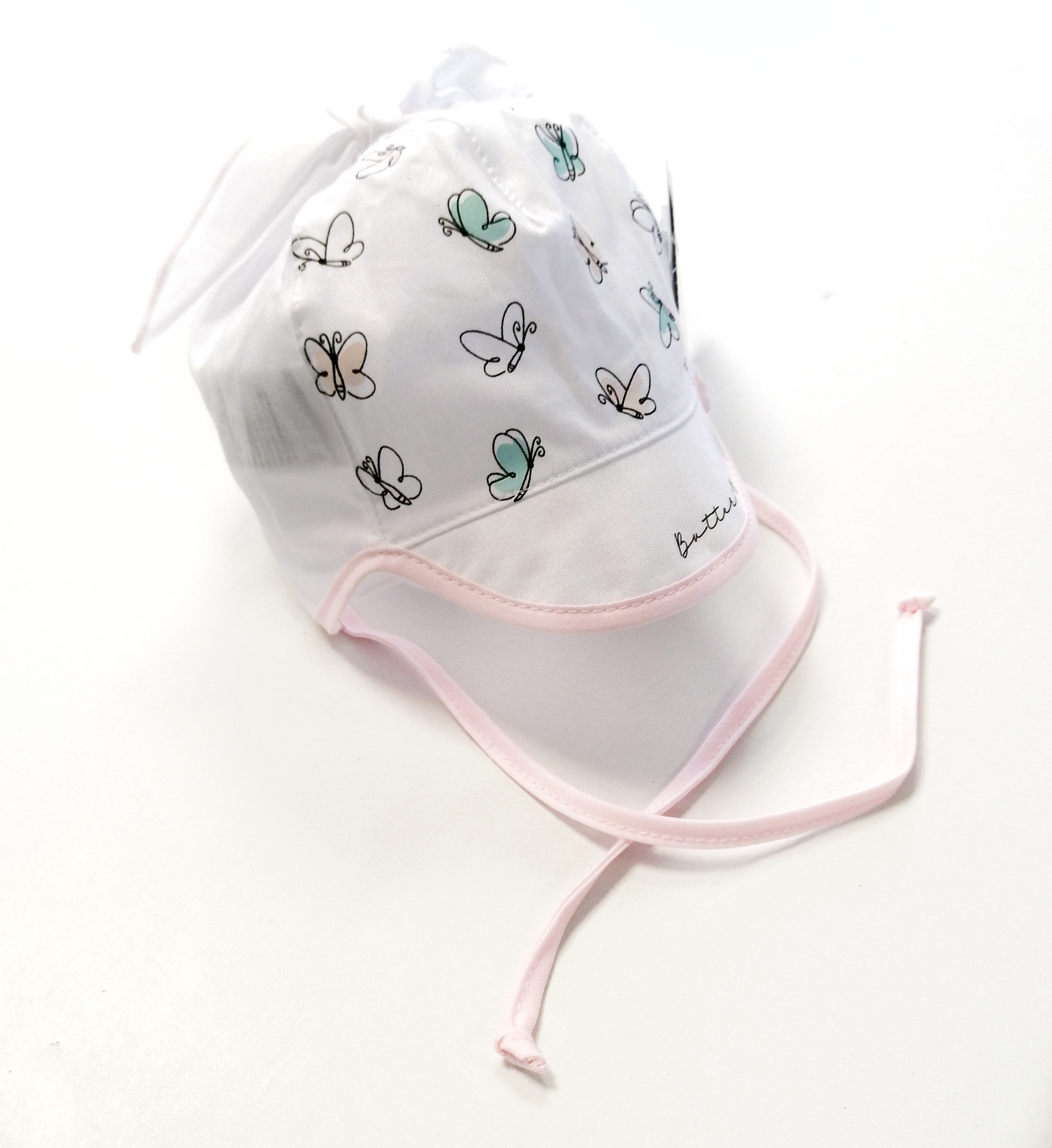 Kojenecká letní čepice na zavazování s potiskem motýlků
