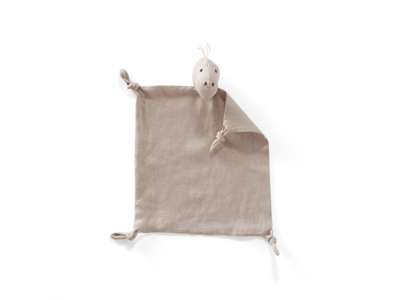 Muchláček Dino s barevnými uzlíky je vyroben ze 100% přírodních materiálů: lněného plátna a výplně z kukuřičných vláken. Uzlíky je možné využít pro připevnění šidítka.
