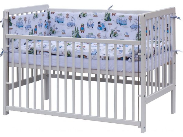 1. Dětská dřevěná postýlka 120 x 60 cm - bílá, masiv borovice, stahovací bok, 6 poloh roštu
