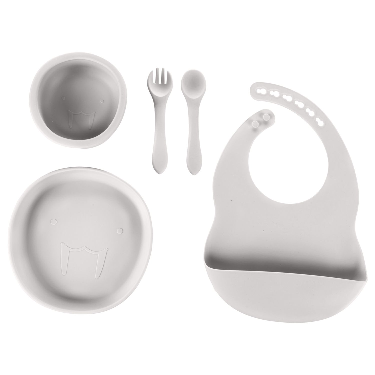 Sada nádobí z potravinářského silikonu obsahuje misku se zvýšenými okraji a přísavkou, dělený talířek s přísavkou, nastavitelný bryndák a lžičku.