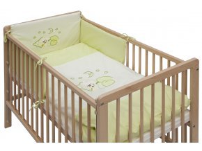 Ochranný límec je okolo poloviny postýlky.(do potahu límce je všitý zip, potah límce se pere samostatně). K uchycení slouží tkaničky v každém rohu.