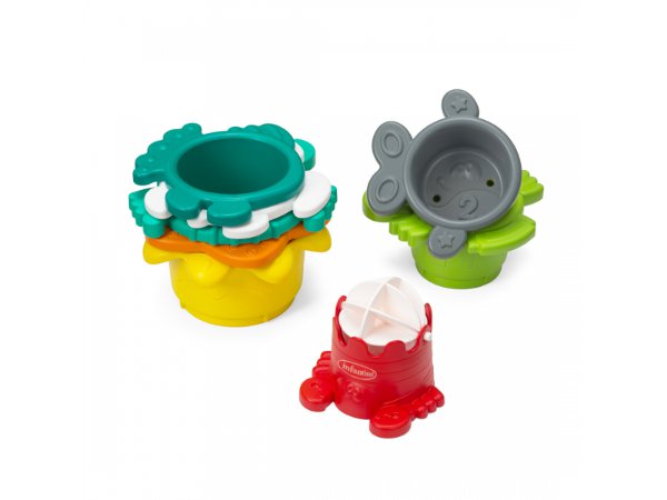 Sada barevných kelímků originálního tvaru přinese vašemu dítěti spoustu zábavy při hraní ve vodě během koupele ve vaně i v bazénku či na pláži. Osm očíslovaných kelímků s perforovaným dnem je možné skládat do sebe i do výšky. Jednotlivé kelímky mají tvar květiny, hvězdice, kraba, želvy, humra či ryby. Součástí nejmenšího kelímku je vodní mlýnek.
