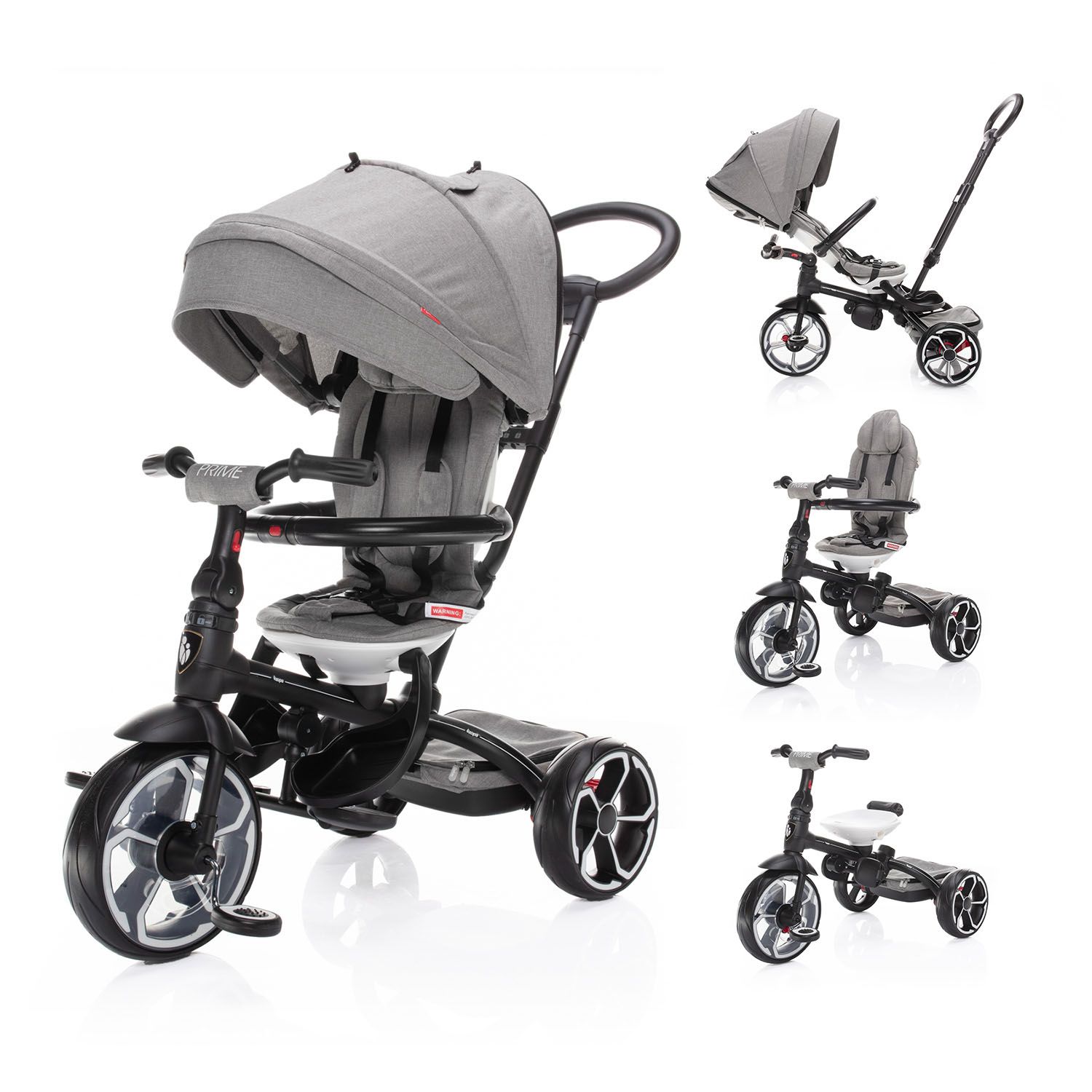 S tím, jak dítě roste a vaše potřeby se mění, tříkolka Prime nabízí možnost 4 režimů použití. V 1. režimu je dítě posazené směrem k rodiči, pedály a řídítka jsou odpojené. Ve 2. režimu je dítě naopak směrem od rodiče, přičemž pedály a řídítka jsou stále odpojené. 3. režim nabízí to, že dítě sedí směrem od rodiče, pedály a řídítka jsou zapojené s možností aktivního pohybu dítěte. A v posledním, 4. režimu sedí dítě obráceně, směrem od rodiče, pedály a řídítka jsou zapojené. Rodič už tříkolku neřídí, vodící tyč je sejmutá a dítě jede zcela samo.